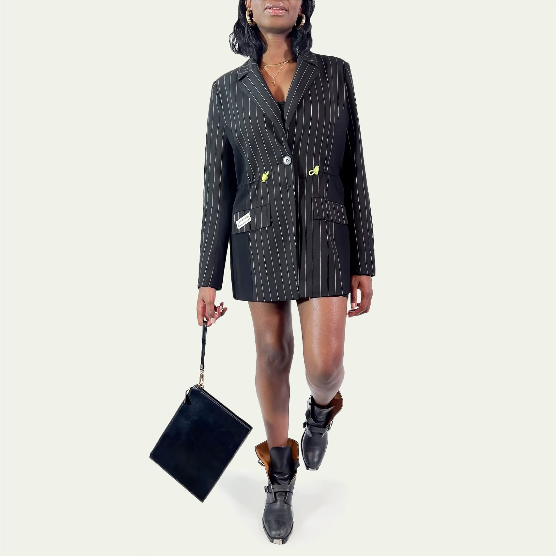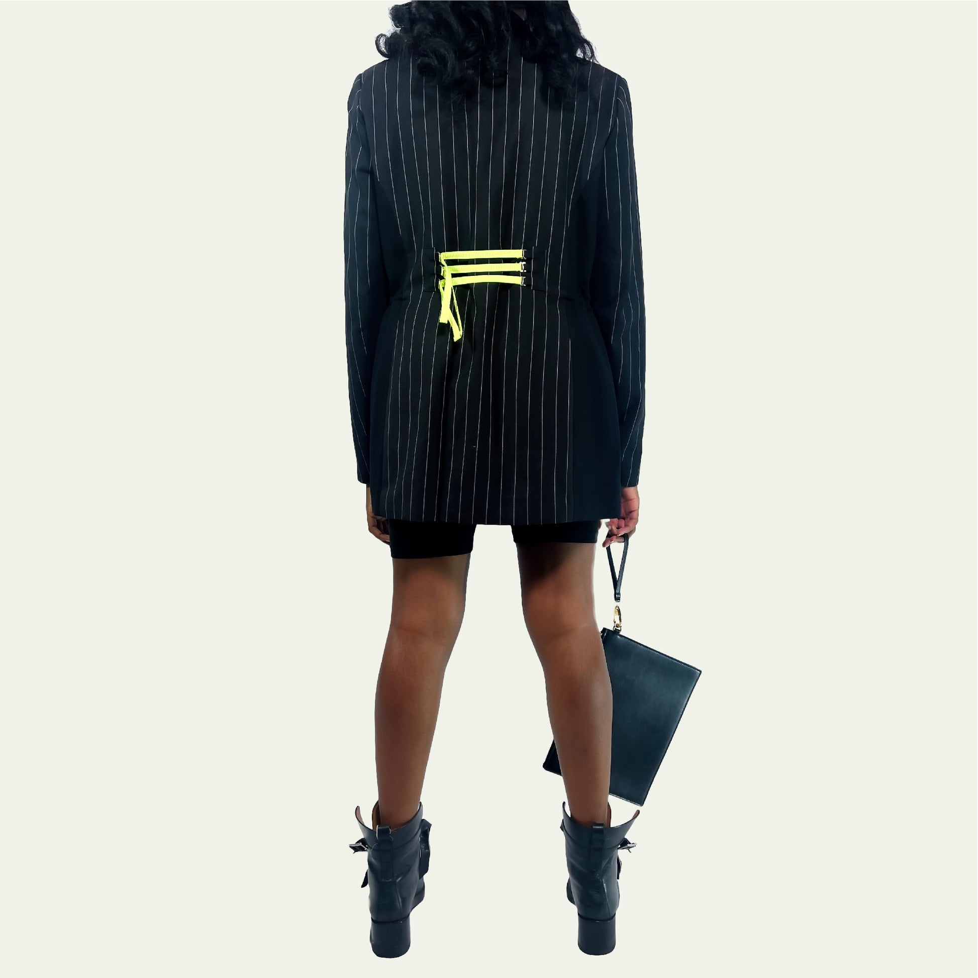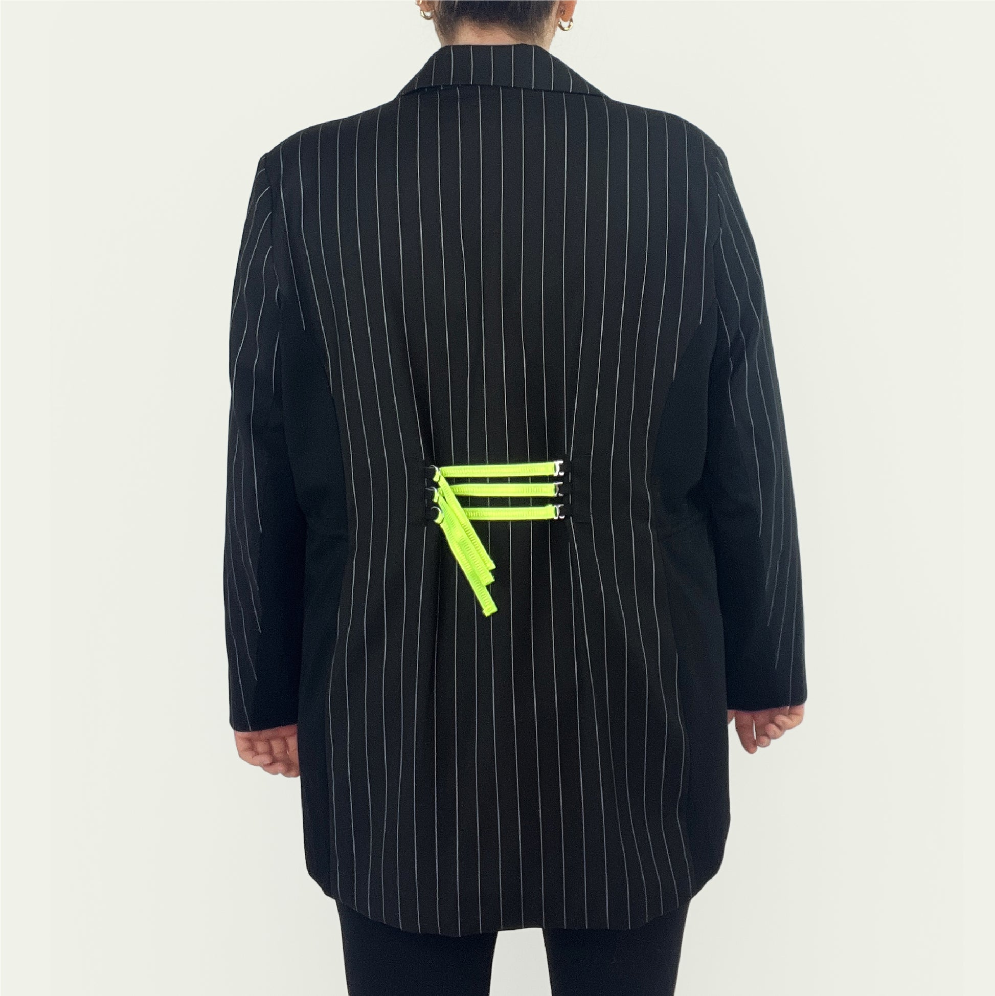 - Black and white pinstripe blazer with green bungees at the sides and removable green straps on the back.