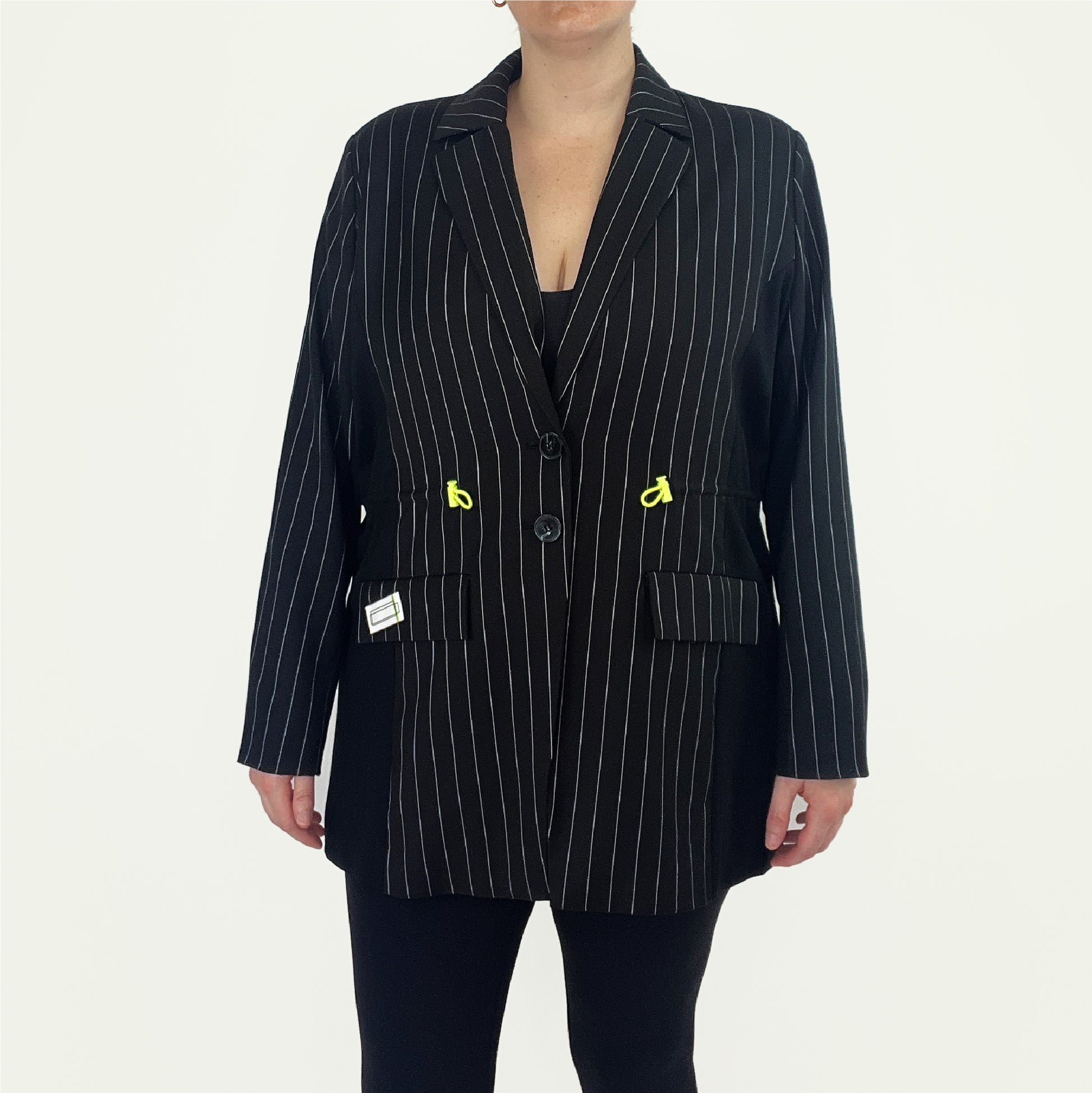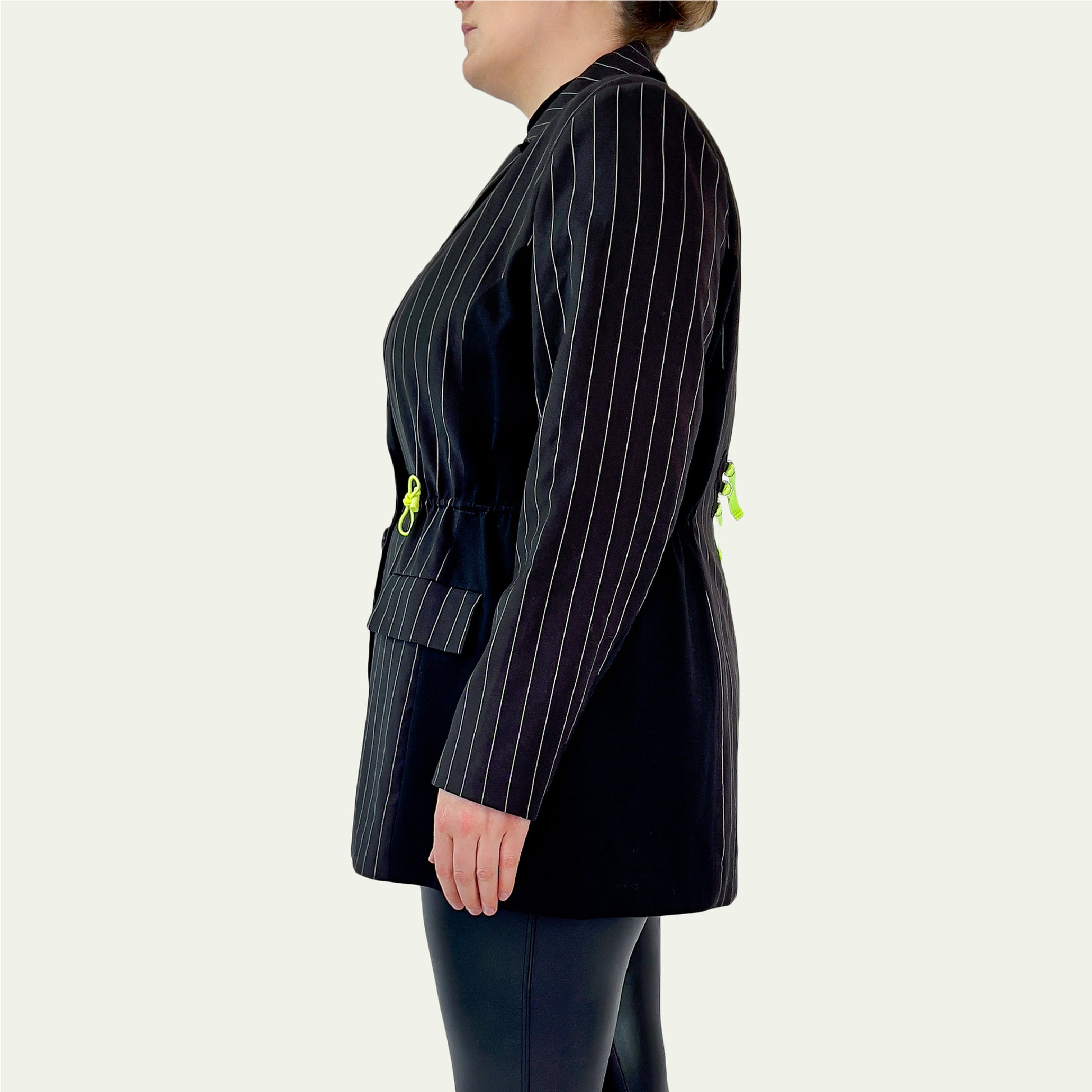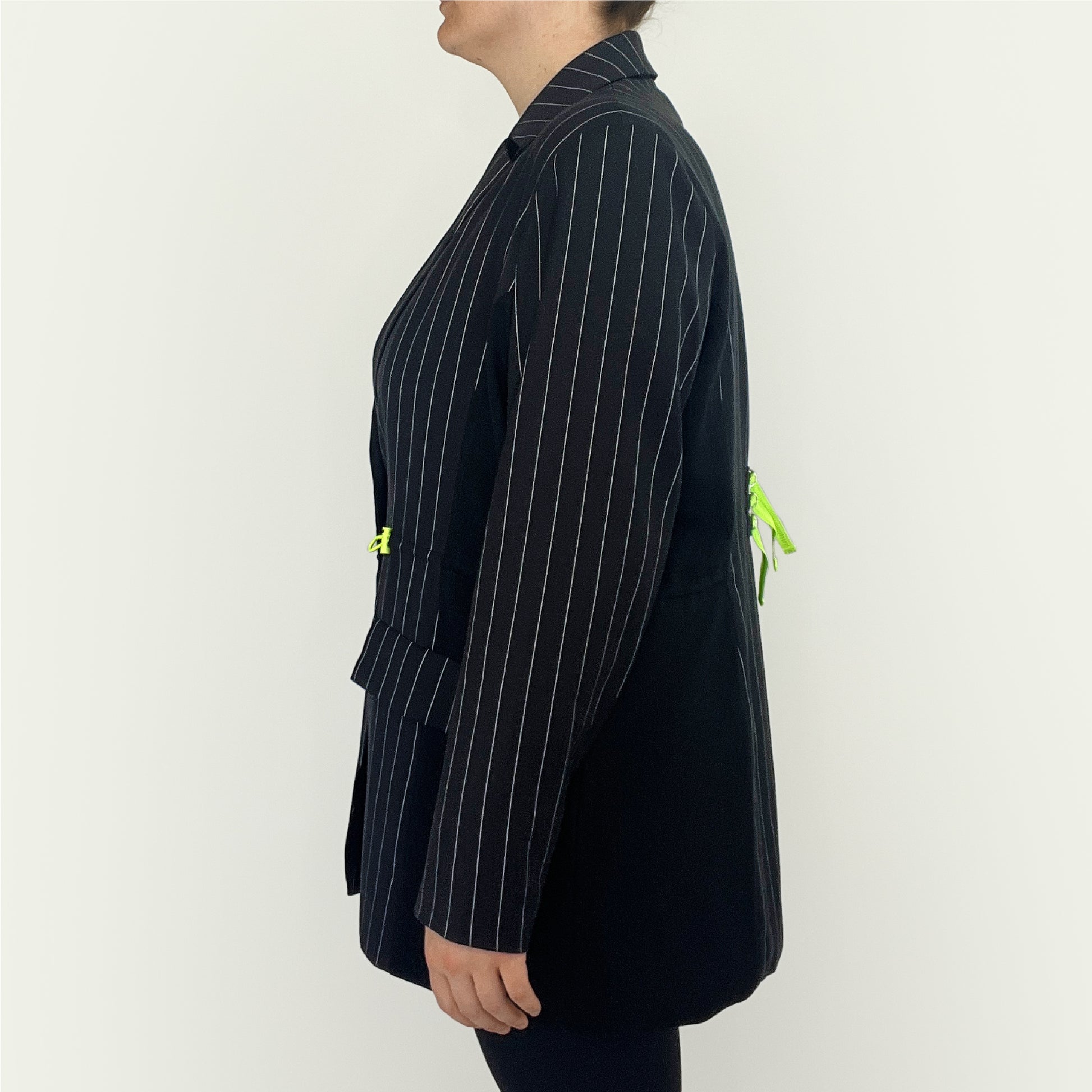 - Black and white pinstripe blazer with green bungees at the sides and removable green straps on the back.