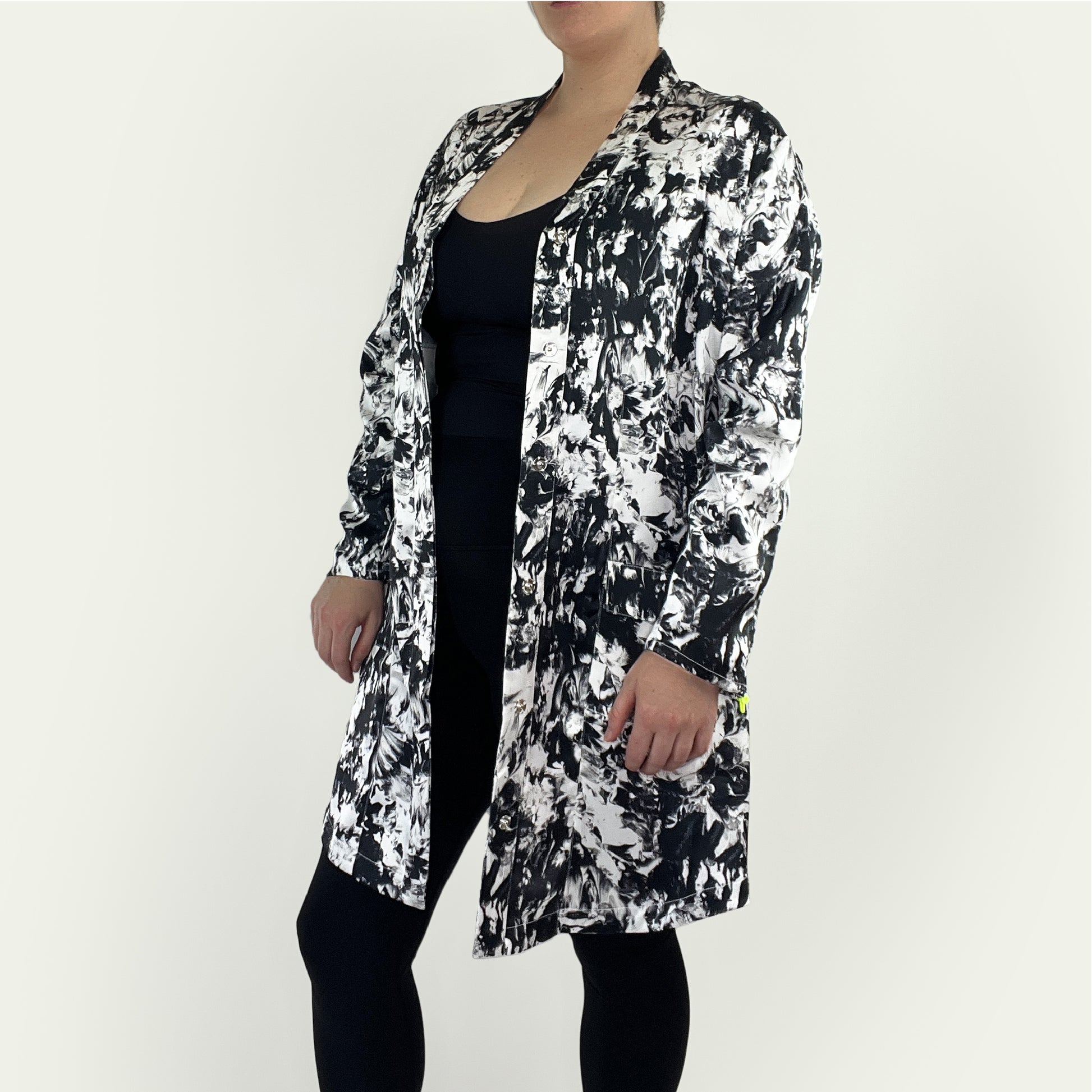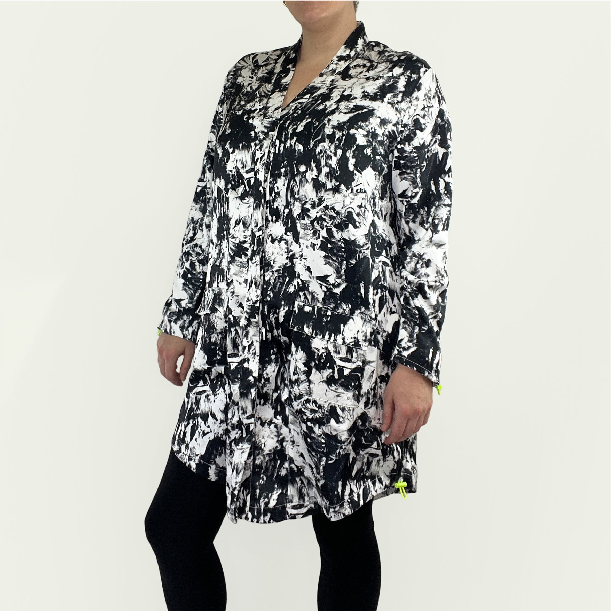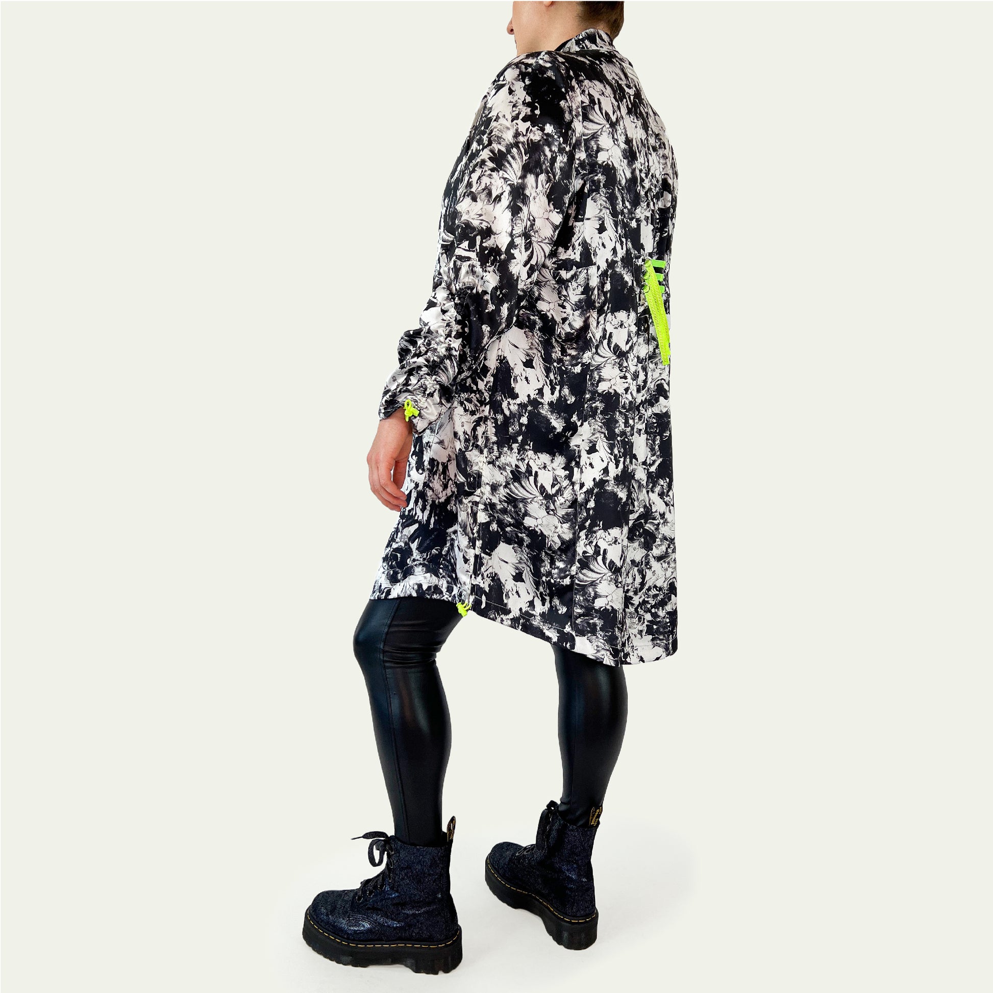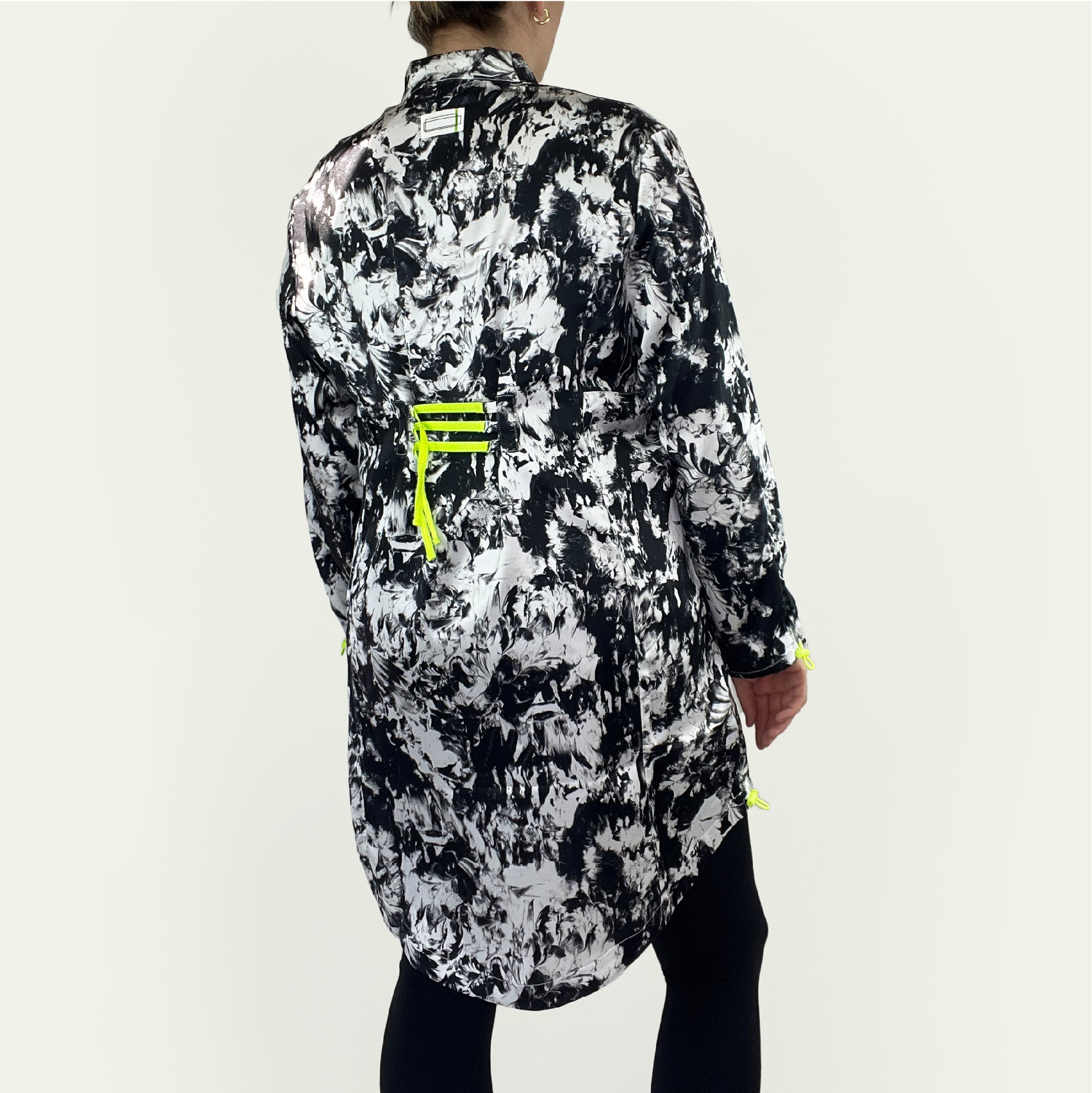 - Black and white marble duster dress with snap-front closure, green bungees at side hems and wrists, and removable green straps on the back.